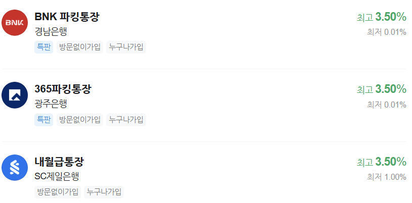 광주은행 '365파킹통장' 기본금리가 3.0%로 가장 높다는 점! 참고하시기 바랍니다.